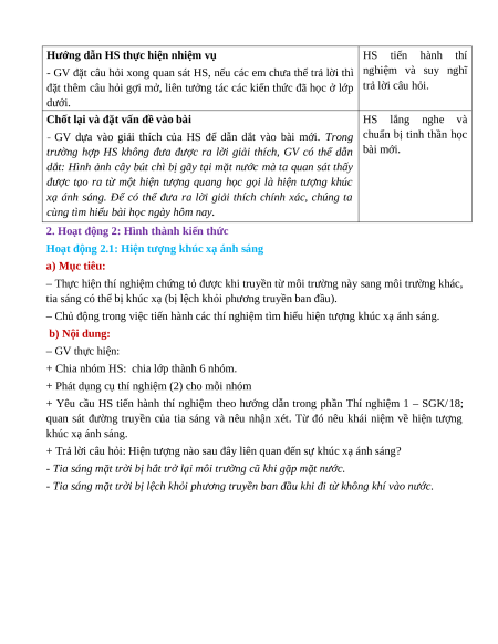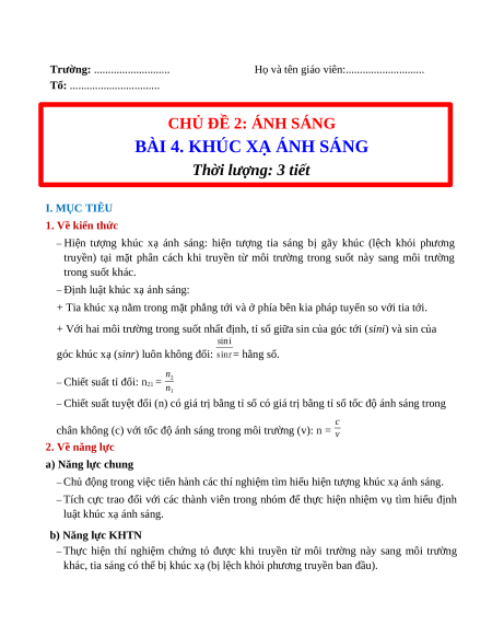 Giáo án Bài 4: Khúc xạ ánh sáng Khoa học tự nhiên 9 Chân trời sáng tạo