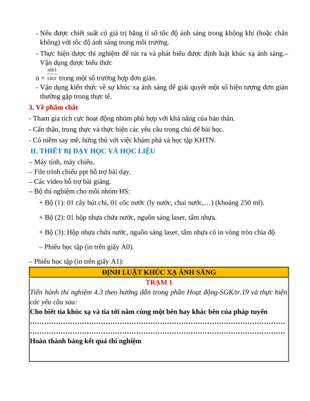 – Tích cực trao đổi với các thành viên trong nhóm để thực hiện nhiệm vụ tìm hiểu định luật khúc xạ ánh sáng. b) Năng lực KHTN