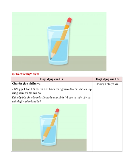 – Nhận biết được hiện tượng khúc xạ ánh sáng trong thực tiễn, từ đó xác định được vấn đề của bài học. b) Nội dung: