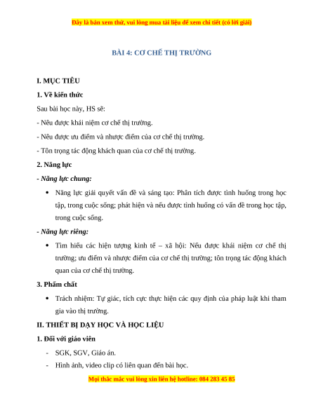 BÀI 4: CƠ CHẾ THỊ TRƯỜNG I. MỤC TIÊU 1. Về kiến thức Sau bài học này, HS sẽ: