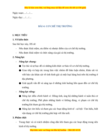 BÀI 4: CƠ CHẾ THỊ TRƯỜNG I. MỤC TIÊU 1. Về kiến thức Sau bài học này, HS sẽ: