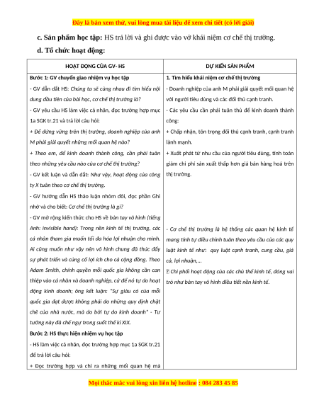c. Sản phẩm học tập: HS trả lời và ghi được vào vở khái niệm cơ chế thị trường.