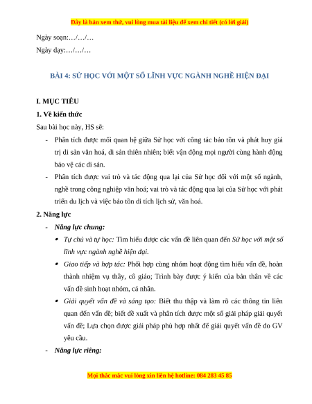 BÀI 4: SỬ HỌC VỚI MỘT SỐ LĨNH VỰC NGÀNH NGHỀ HIỆN ĐẠI I. MỤC TIÊU 1. Về kiến thức Sau bài học này, HS sẽ: