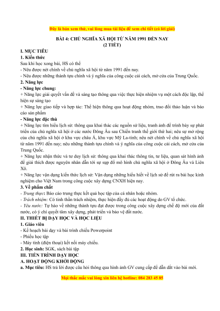 BÀI 4: CHỦ NGHĨA XÃ HỘI TỪ NĂM 1991 ĐẾN NAY (2 TIẾT) I. MỤC TIÊU 1. Kiến thức
