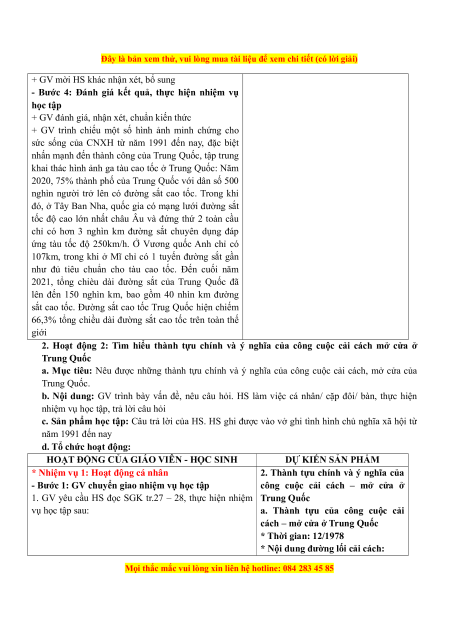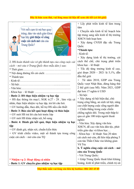 GV nêu nhiệm vụ học tập sau: Thành tựu trong công cuộc cải cách, mở cửa của Trung Quốc từ