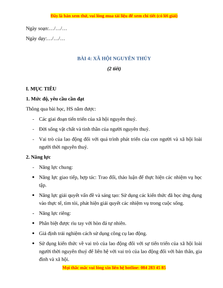 BÀI 4: XÃ HỘI NGUYÊN THỦY (2 tiết) I. MỤC TIÊU