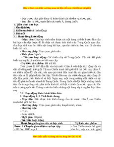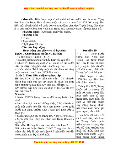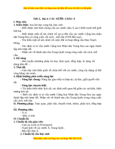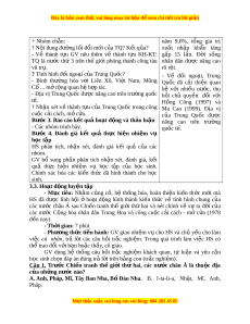 hân dân Trung Hoa sau ngày thành l p t ậ rên lư c đ ợ . ồ - Phư ng pháp ơ : Tr c quan, phát ự vấn, nhóm. - Phư ng t ơ i n ệ + Ti vi. + Máy vi tính. - Th i ờ gian: 20 phút. - T ch ổ ức ho t ạ đ ng ộ Hoạt đ ng c ộ a g ủ iáo viên và h c ọ sinh Dự ki n ế SP Bước 1. Chuy n gi ể ao nhi m ệ v h ụ c t ọ p ậ + 1 – 1 – 1949 nư c ớ - HS đ c m ọ c1, 4 ph ụ n I ầ I SGK. C ng ộ hoà Nhân dân - Chia l p ớ thành 6 nhóm và th o l ả u n ậ các câu h i ỏ : Trung Hoa đư c ợ thành + Nhóm l : ẻ Trình bày m t