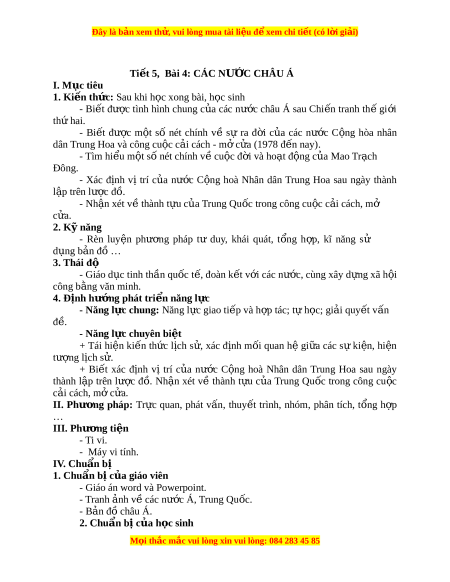 ế 5, Bài 4: CÁC NƯ C Ớ CHÂU Á I. M c t ụ iêu 1. Ki n t ế h c: ứ Sau khi h c xong ọ bài, h c ọ sinh - Bi t ế đư c ợ tình hình chung c a ủ các nư c ớ châu Á sau Chi n ế tranh th ế gi i ớ th hai ứ . - Bi t ế đư c ợ m t