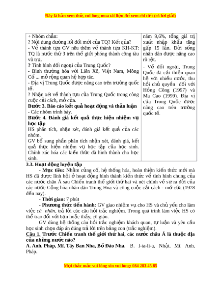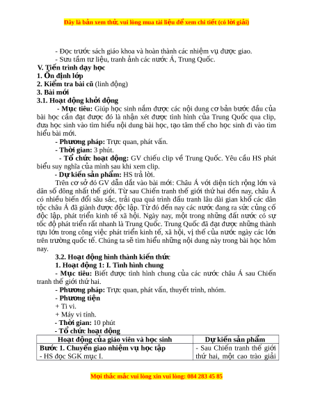 ộ châu Á đã giành đư c ợ đ c ộ l p. ậ T ừ đó đ n ế nay các nư c ớ đang ra s c ứ c ng ủ cố đ c ộ l p, ậ phát tri n ể kinh tế xã h i ộ . Ngày nay, m t ộ trong nh ng ữ đ t ấ nư c ớ có sự tốc đ ộ phát tri n ể r t ấ nhanh là Trung Qu c. ố Trung Qu c ố đã đ t ạ đư c ợ nh ng ữ thành t u ự l n ớ trong công vi c ệ phát tri n ể kinh t , ế xã h i ộ , v ịth ế c a ủ nư c ớ ngày các l n ớ trên trư ng ờ qu c t ố . ế Chúng ta sẽ tìm hi u ể nh ng ữ n i ộ dung này trong bài h c ọ hôm nay. 3.2. Hoạt đ ng h ộ ình thành ki n t ế h c ứ 1. Hoạt đ ng 1 ộ : I. Tình hình chung - M c ụ tiêu: Bi t ế đư c ợ tình hình chung c a ủ các nư c ớ châu Á sau Chi n ế tranh th gi ế i ớ th hai ứ . - Phư ng pháp ơ : Tr c quan, phát ự vấn, thuy t ế trình, nhóm. - Phư ng t ơ i n ệ + Ti vi. + Máy vi tính. - Th i ờ gian: 10 phút - T ch ổ ức ho t ạ đ ng ộ Hoạt đ ng c ộ a g ủ iáo viên và h c ọ sinh Dự ki n s ế n ph ả m ẩ Bước 1. Chuy n gi ể ao nhi m ệ v h ụ c t ọ p ậ - Sau Chi n ế tranh thế gi i ớ - HS đ c SG ọ K m c I ụ . thứ hai, m t ộ cao trào gi i ả M i ọ thắc m c