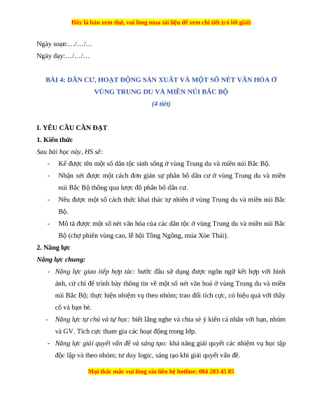 Giáo án Bài 4 Lịch sử & Địa lí lớp 4 Cánh diều: Dân cư, hoạt động sản xuất và một số nét văn hóa ở vùng Trung du và miền núi Bắc Bộ