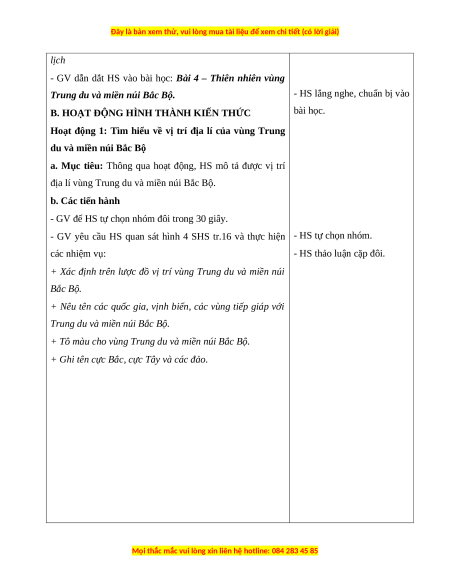 Giáo án Bài 4 Lịch sử & Địa lí lớp 4 Chân trời sáng tạo: Thiên nhiên vùng trung du và miền núi Bắc Bộ