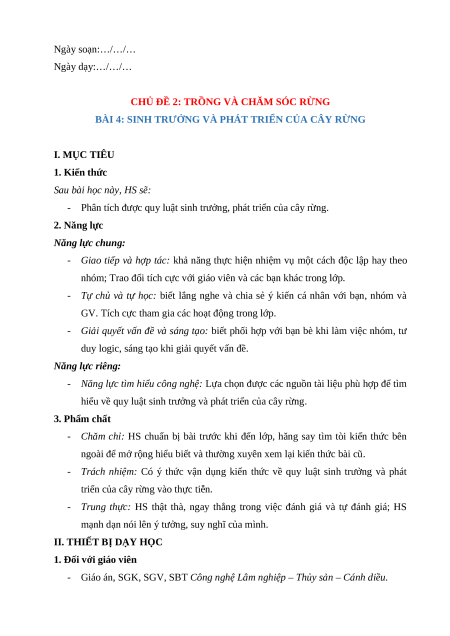 Giáo án Bài 4: Sinh trưởng và phát triển của cây rừng Công nghệ 12 Cánh diều