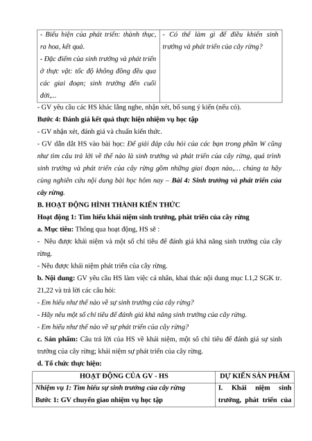 c. Sản phẩm: HS nêu được một số thông tin về sinh trưởng và phát triển của cây rừng.