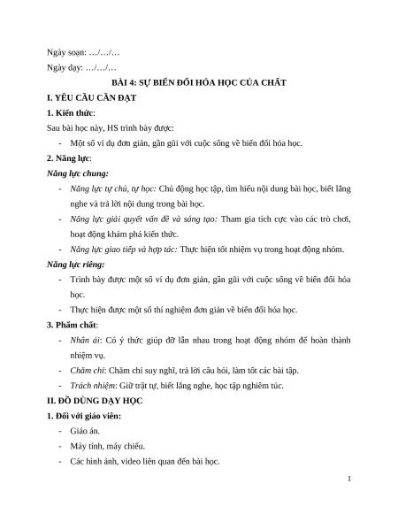- Một số ví dụ đơn giản, gần gũi với cuộc sống về biến đổi hóa học. 2. Năng lực: