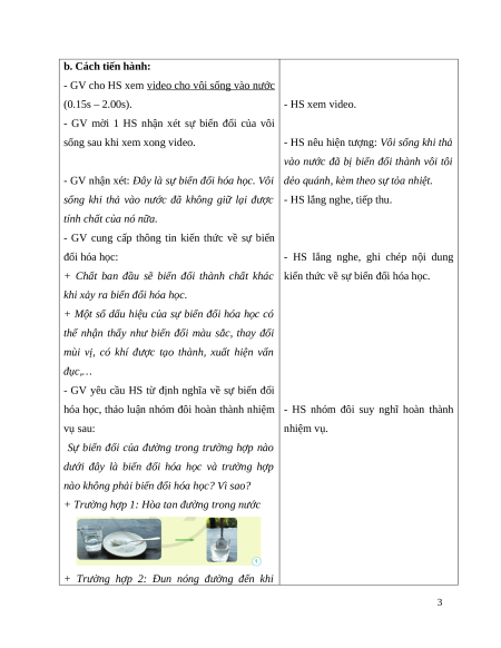 - GV nhận xét: Đây là sự biến đổi hóa học. Vôi dẻo quánh, kèm theo sự tỏa nhiệt.