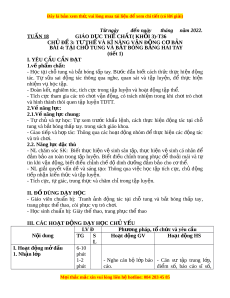 ấ ay. trong sách giáo khoa. - Giao ti p ế và h p ợ tác: Thông qua các ho t ạ đ ng ộ nhóm đ t ể h c ự hi n ệ các đ ng ộ tác và trò ch i ơ . 2.2. Năng l c đ ự c t ặ hù - NL chăm sóc SK: Bi t ế th c ự hi n ệ v ệ sinh sân t p, ậ th c ự hi n ệ v ệ sinh cá nhân để đ m ả b o ả an toàn trong t p ậ luy n. ệ Bi t ế đi u ề ch nh ỉ trang ph c ụ đ ể tho i ả mái và tự tin khi v n ậ đ ng, bi ộ t ế đi u ch ề nh ch ỉ đ ế di ộ nh dư ng ỡ đ m ả b o ả cho c t ơ h . ể - NL gi i ả quy t ế v n ấ dề và sáng t o: ạ Thông qua vi c ệ h c ọ t p ậ tích c c, ự ch ủ đ ng ộ ti p nh ế n ậ ki n t ế h c và t ứ p ậ luy n. ệ - Tích c c, t ự ự giác, trung th c ự và chăm ch t ỉ rong t p ậ luy n. ệ II. Đ D Ồ ÙNG D Y Ạ H C Ọ - Giáo viên chu n ẩ b : ị Tranh nh ả đ ng ộ tác t i ạ chỗ tung và b t ắ bóng th p ấ tay, trang ph c t ụ h t ể hao, còi ph c v ụ t ụ rò ch i ơ . - H c s ọ inh chu n b ẩ :