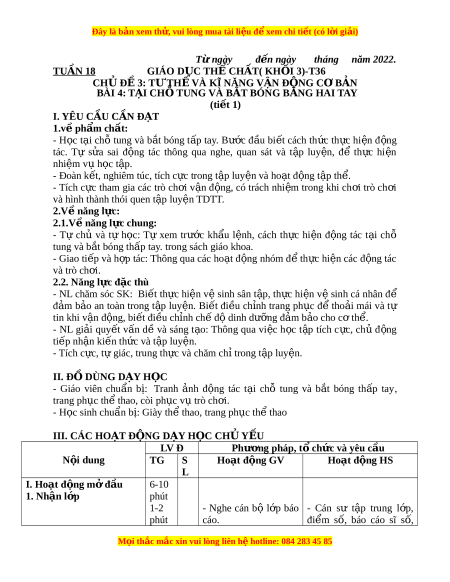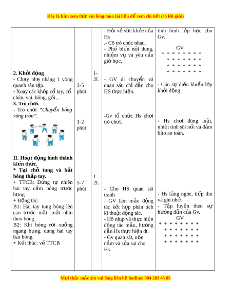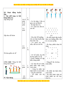 Đây là bản xem th , vu ử i lòng mua tài li u ệ đ xe ể m chi ti t (c ế ó l i ờ gi i ả ) - H i ỏ v s ề c ứ kh e c ỏ a ủ tình hình l p ớ h c ọ cho Hs Gv. .- Cô trò chúc nhau. - Phổ bi n ế n i ộ dung, GV nhi m ệ vụ và yêu c u ầ * * * * * * * * gi h ờ c. ọ * * * * * * * * * * * * * * 2. Kh i ở đ ng ộ 1- * * * * * * * - Ch y ạ nhẹ nhàng 1 vòng 2L - GV di chuy n ể và quanh sân t p. ậ 3-5 quan sát, chỉ d n ẫ cho - Cán sự đi u ề khi n ể l p ớ - Xoay các kh p c ớ ổ tay, cổ phút HS th c hi ự n. ệ kh i ở đ ng . ộ chân, vai, hông, gối,... 3. Trò ch i ơ . - Trò ch i ơ “Chuy n ể bóng vòng tròn”. -Gv tổ ch c ứ Hs ch i ơ 1-2 trò ch i ơ . - Hs ch i ơ đúng lu t ậ , phút nhi t ệ tình sôi n i ổ và đ m ả b o an t ả oàn. II. Hoạt đ ng ộ hình thành ki n t ế h c. ứ * T i ạ chỗ tung và b t ắ bóng th p t ấ ay. 1- + TTCB: Đ ng ứ tự nhiên 5-7 2L hai tay c m ầ bóng trư c ớ phút - Cho HS quan sát b ng ụ tranh - Hs l ng ắ nghe, ti p ế thu + Đ ng t ộ ác: - GV làm m u ẫ đ ng ộ và ghi nh . ớ B1: Hai tay tung bóng lên tác k t ế h p ợ phân tích - T p ậ luy n ệ theo sự cao trư c ớ m t ặ , m t ắ nhìn kĩ thu t ậ đ ng t ộ ác. hư ng d ớ ẫn c a G ủ v. theo bóng. - Hô nh p ị và th c ự hi n ệ GV B2: Khi bóng r i ơ xu ng ố đ ng ộ tác m u, ẫ hư ng ớ * * * * * * * * ngang b ng, ụ dung hai tay dẫn Hs th c hi ự ện đt. * * * * * * * b t ắ bóng. - Gv quan sát, uốn * * * * * * * + K t ế thúc: v ề TTCB n m ắ và s a ử sai cho * * * * * * * Hs. M i