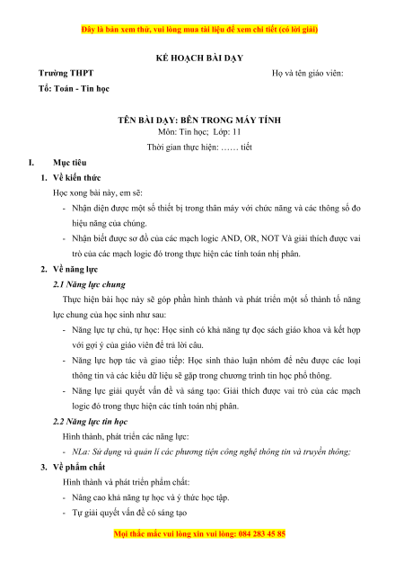 Đây là bản xem thử, vui lòng mua tài liệu để xem chi tiết (có lời giải) KẾ HOẠCH BÀI DẠY Trường THPT Họ và tên giáo viên: Tổ: Toán - Tin học