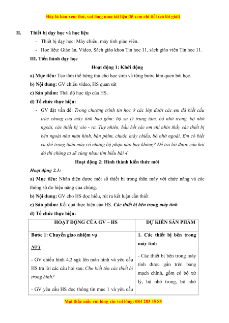c) Sản phẩm: Kết quả thực hiện của HS. Các thiết bị bên trong máy tính d) Tổ chức thực hiện: