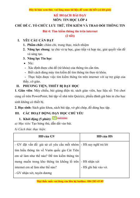 Đây là bản xem thử, vui lòng mua tài liệu để xem chi tiết (có lời giải) KẾ HOẠCH BÀI DẠY MÔN: TIN HỌC LỚP 4