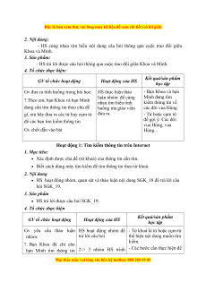 - HS trả lời được câu hỏi thông qua cuộc trao đổi giữa Khoa và Minh. 4. Tổ chức thực hiện: Kết quả/sản phẩm GV tổ chức hoạt động Hoạt động của HS học tập