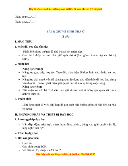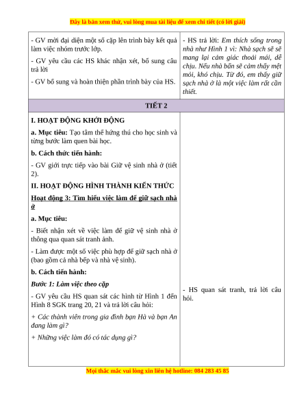 BÀI 4: GIỮ VỆ SINH NHÀ Ở (2 tiết) I. MỤC TIÊU