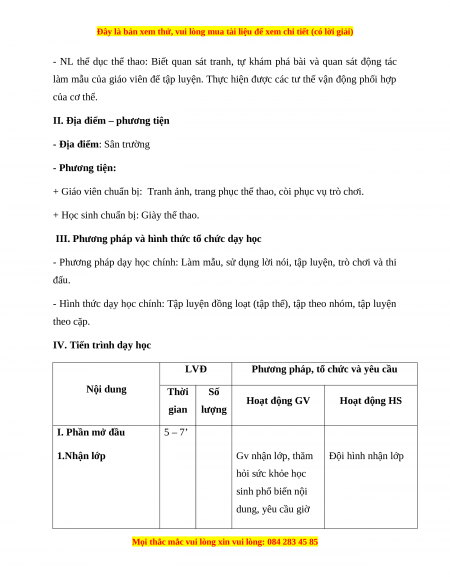 - Phương pháp dạy học chính: Làm mẫu, sử dụng lời nói, tập luyện, trò chơi và thi đấu.