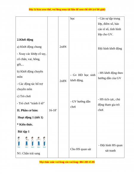 học - Cán sự tập trung lớp, điểm số, báo cáo sĩ số, tình hình lớp cho GV. 2.Khởi động a) Khởi động chung 2x8N Đội hình khởi động - Xoay các khớp cổ tay, cổ chân, vai, hông, gối,... b) Khởi động chuyên - HS khởi động theo - Gv HD học sinh môn hướng dẫn của GV 2x8N khởi động.