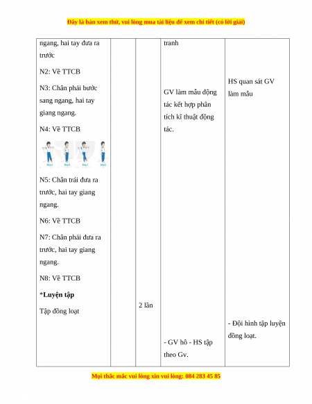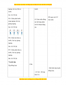 ngang, hai tay đưa ra tranh trước N2: Về TTCB HS quan sát GV N3: Chân phải bước GV làm mẫu động làm mẫu sang ngang, hai tay tác kết hợp phân giang ngang. tích kĩ thuật động N4: Về TTCB tác. N5: Chân trái đưa ra trước, hai tay giang ngang. N6: Về TTCB N7: Chân phải đưa ra trước, hai tay giang ngang. N8: Về TTCB *Luyện tập 2 lần Tập đồng loạt - Đội hình tập luyện đồng loạt. - GV hô - HS tập theo Gv.