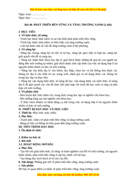 Bài 40. PHÁT TRIỂN BỀN VỮNG VÀ TĂNG TRƯỞNG XANH (2 tiết) I. MỤC TIÊU