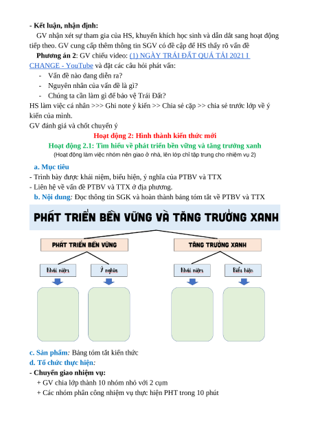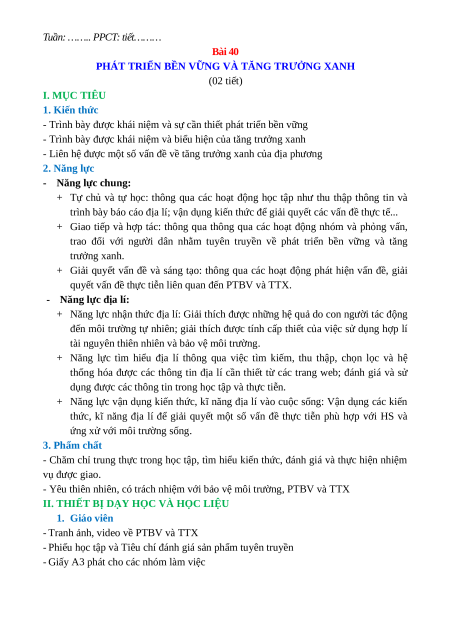 PHÁT TRIỂN BỀN VỮNG VÀ TĂNG TRƯỞNG XANH (02 tiết) I. MỤC TIÊU 1. Kiến thức