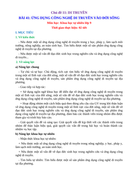 - Nêu được một số vấn đề đạo đức sinh học trong nghiên cứu và ứng dụng công nghệ di truyền... 2. Về năng lực a) Năng lực chung