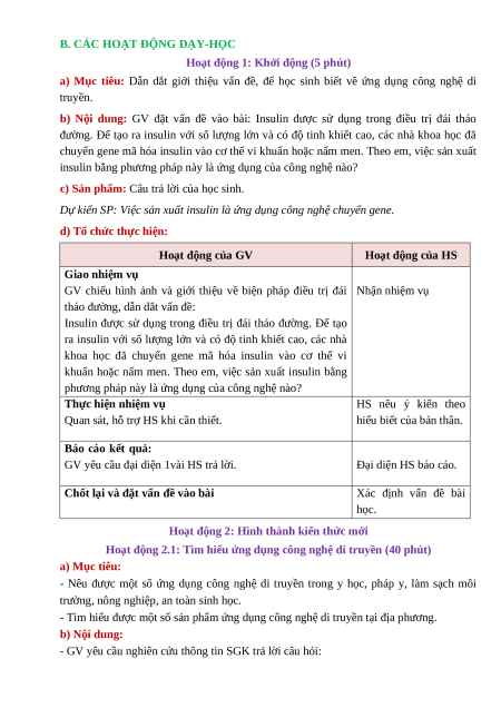 Hoạt động 2.1: Tìm hiểu ứng dụng công nghệ di truyền (40 phút) a) Mục tiêu: