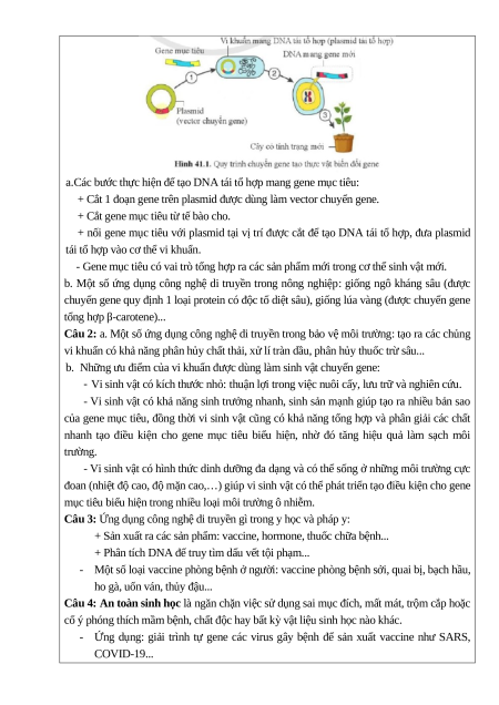 Câu 1: a. Quan sát hình 41.1 cho biết các bước thực hiện để tạo DNA tái tổ hợp mang