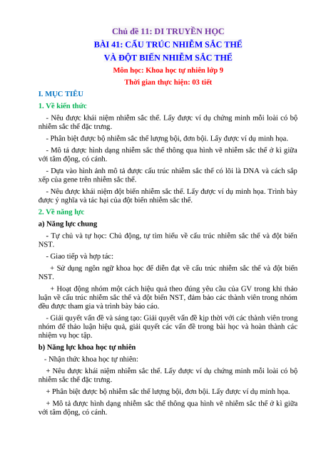 Giáo án Bài 41 KHTN 9 Chân trời sáng tạo (2024): Cấu trúc nhiễm sắc thể và đột biến nhiễm sắc thể