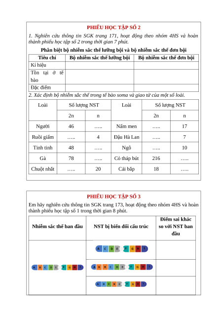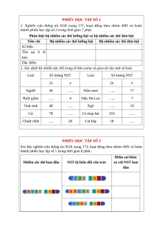 2. Xác định bộ nhiễm sắc thể trong tế bào soma và giao tử của một số loài. Loài Số lượng NST Loài Số lượng NST 2n n 2n n Người 46 ….. Nấm men ….. 17 Ruồi giấm ….. 4 Đậu Hà Lan ….. 7 Tinh tinh 48 ….. Ngô ….. 10 Gà 78 ….. Cỏ tháp bút 216 ….. Chuột nhắt ….. 20 Cải bắp 18 …..