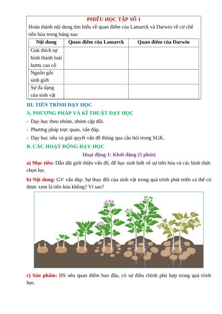 quan điểm của Lamarck và Darwin về cơ chế tiến hóa, hoàn thành PHT số 1.