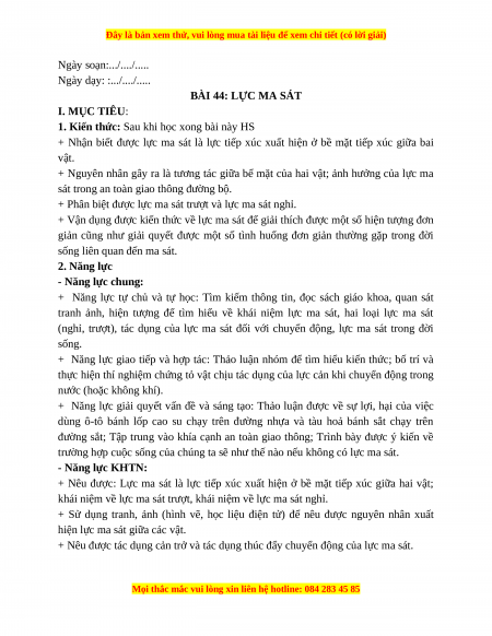 Ngày dạy: :.../..../..... BÀI 44: LỰC MA SÁT I. MỤC TIÊU: