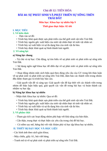 Giáo án Bài 44 KHTN 9 Cánh diều (2024): Sự phát sinh và phát triển sự sống trên Trái Đất