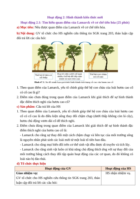 + Nêu được quan điểm của Lamarck về cơ chế tiến hóa.