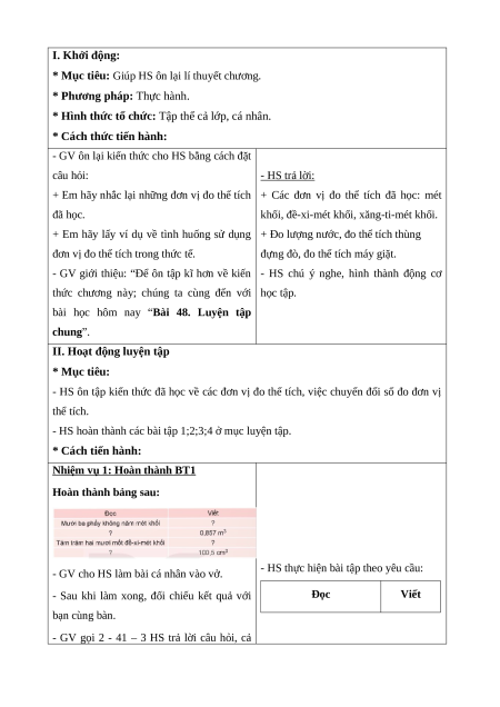 - HS ôn tập kiến thức đã học về các đơn vị đo thể tích, việc chuyển đổi số đo đơn vị thể tích.