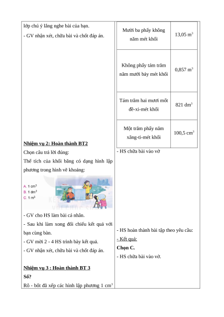 - Giải quyết tình huống thực tế gắn với số đo thể tích.