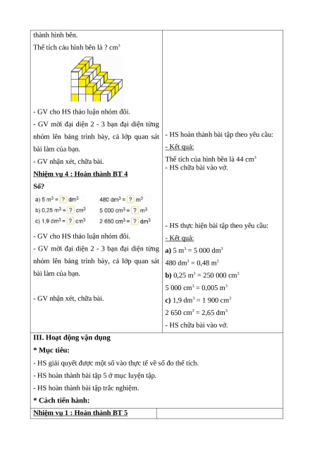- HS giải quyết được một số vào thực tế về số đo thể tích.