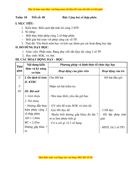 Tuần: 10 Tiết số: 48 Bài: Cộng hai số thập phân