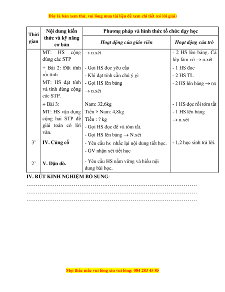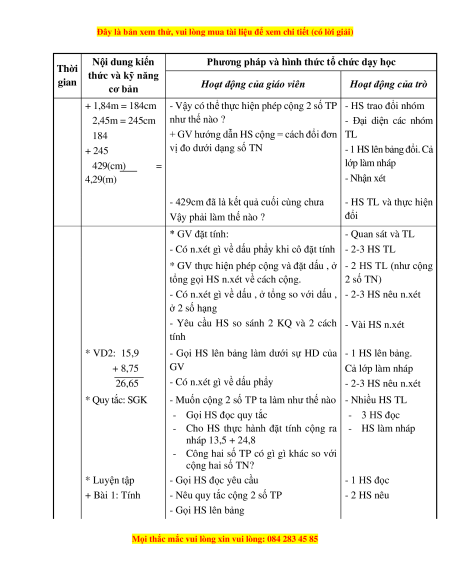 1. Kiến thức: Biết cách đặt tính rồi cộng 2 STP. 2. Kĩ năng: