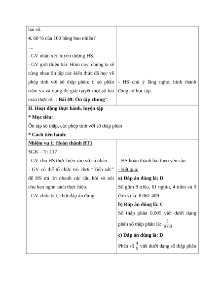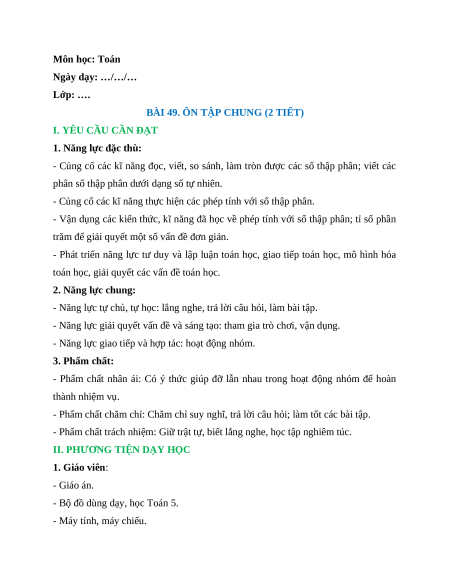 Giáo án Bài 49: Ôn tập chung Toán lớp 5 Cánh diều