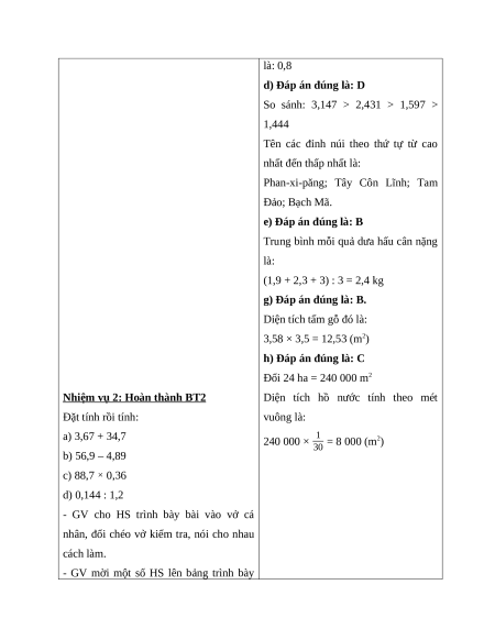 Diện tích hồ nước tính theo mét Đặt tính rồi tính: vuông là: a) 3,67 + 34,7 1 240 000 × = 8 000 (m2) 30 b) 56,9 – 4,89 c) 88,7 × 0,36 d) 0,144 : 1,2