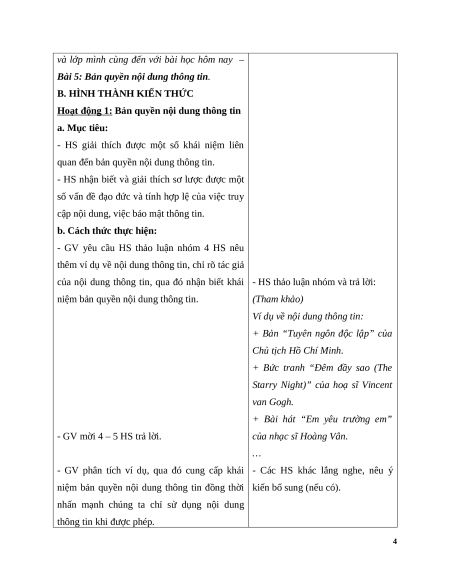 Hoạt động 1: Bản quyền nội dung thông tin a. Mục tiêu: