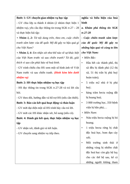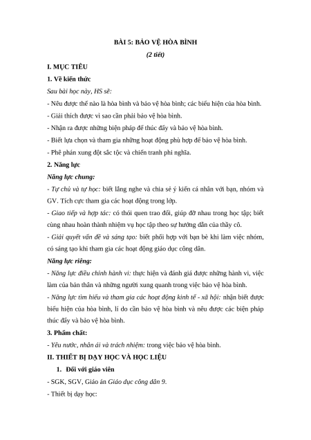 BÀI 5: BẢO VỆ HÒA BÌNH (2 tiết) I. MỤC TIÊU 1. Về kiến thức