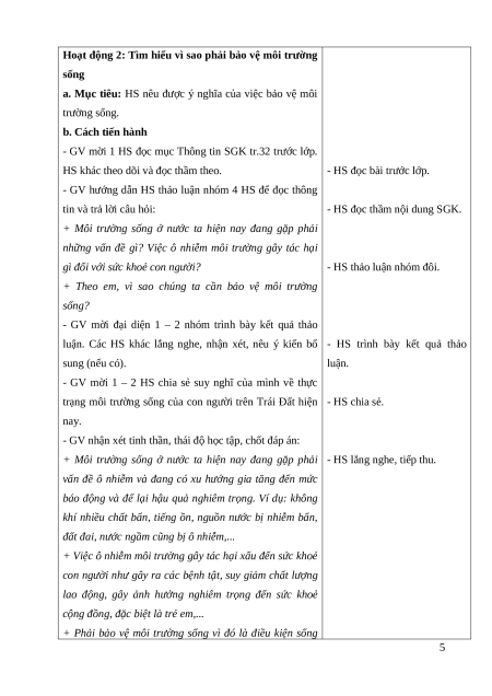 Giáo án Bài 5: Bảo vệ môi trường sống Đạo đức lớp 5 Kết nối tri thức